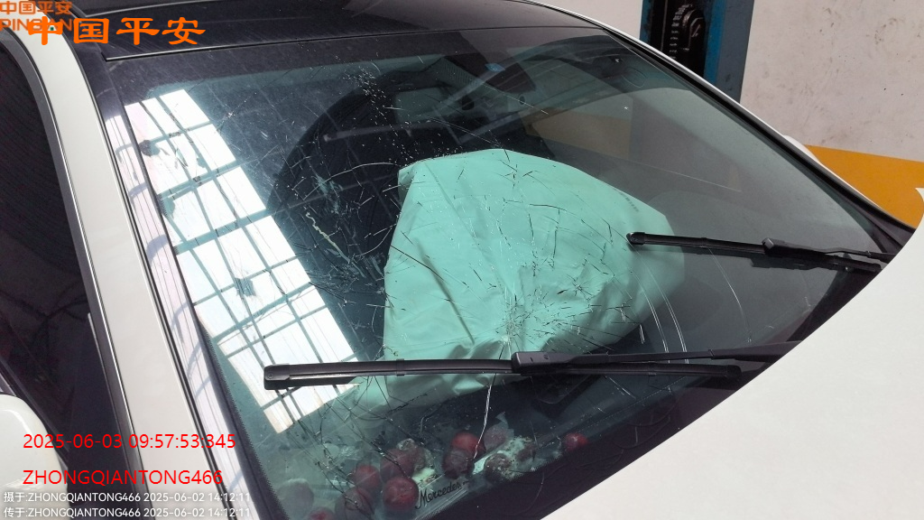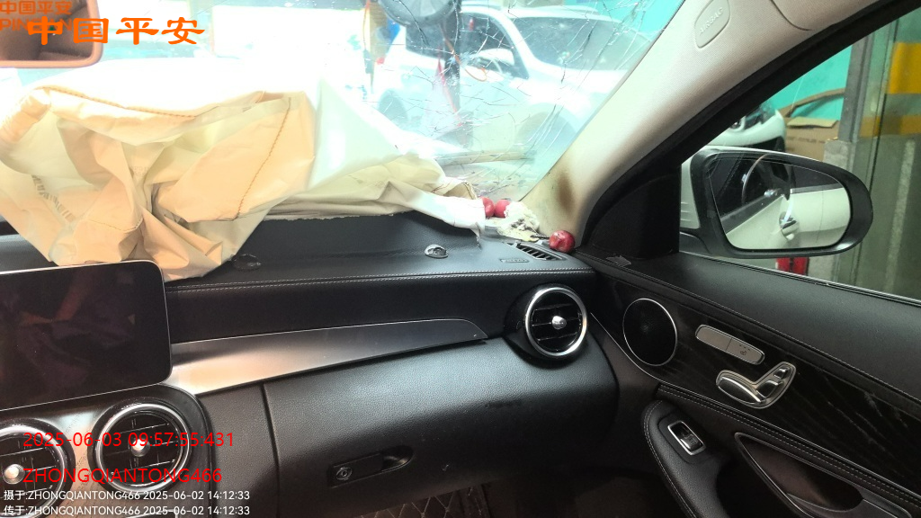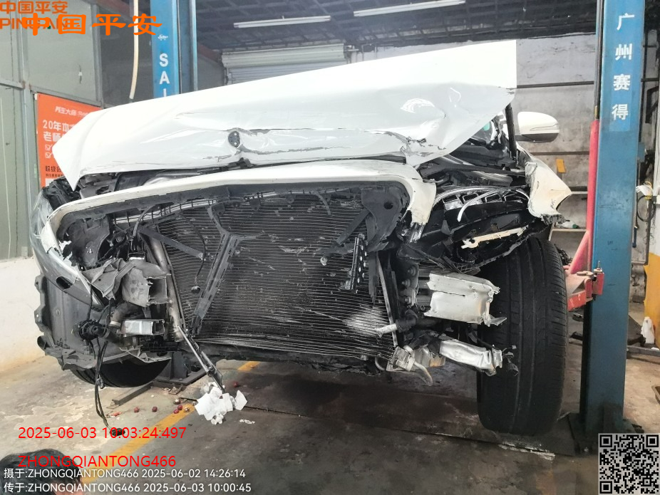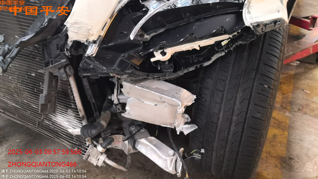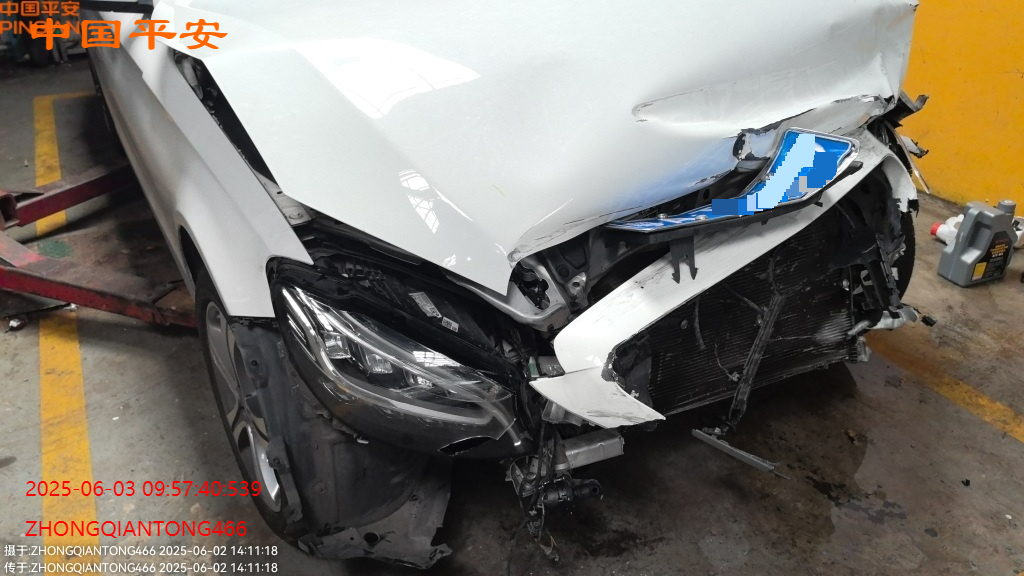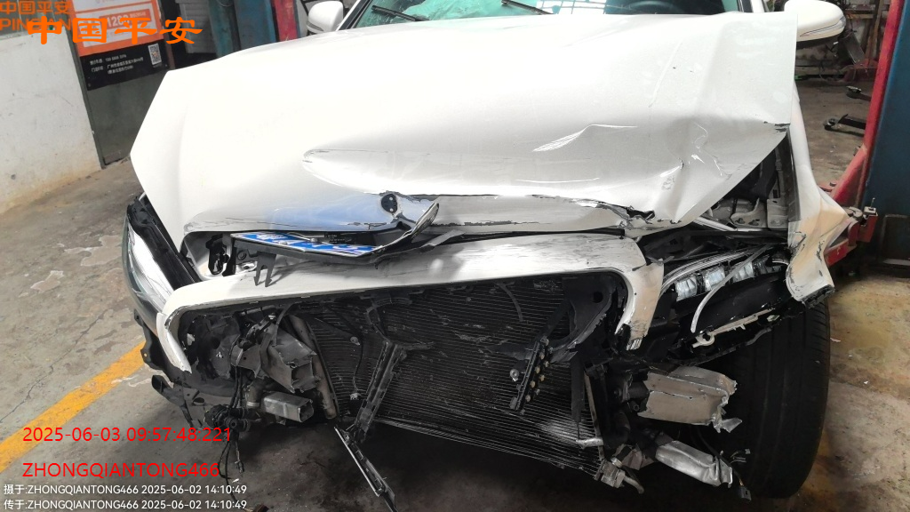 标的前部受损,车内气囊已爆,受损如图所示,无二次事故,
